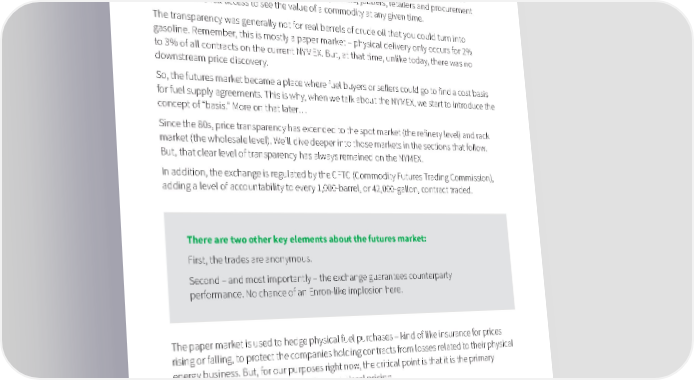 What Does This Mean for My Fuel Operation? One Word: Transparency. The NYMEX really took off as a major factor in the U.S. petroleum market back in the 1980s because it was the only place refiners, suppliers, traders, jobbers, retailers and procurement end-users had full access to see the value of a commodity at any given time. The transparency was generally not for real barrels of crude oil that you could turn into gasoline. Remember, this is mostly a paper market – physical delivery only occurs for 2% to 3% of all contracts on the current NYMEX. But, at that time, unlike today, there was no downstream price discovery. So, the futures market became a place where fuel buyers or sellers could go to find a cost basis for fuel supply agreements. This is why, when we talk about the NYMEX, we start to introduce the concept of “basis.” More on that later… Since the 80s, price transparency has extended to the spot market (the refinery level) and rack market (the wholesale level). We’ll dive deeper into those markets in the sections that follow. But, that clear level of transparency has always remained on the NYMEX. In addition, the exchange is regulated by the CFTC (Commodity Futures Trading Commission), adding a level of accountability to every 1,000-barrel, or 42,000-gallon, contract traded. There are two other key elements about the futures market: First, the trades are anonymous. Second – and most importantly – the exchange guarantees counterparty performance. No chance of an Enron-like implosion here. The paper market is used to hedge physical fuel purchases – kind of like insurance for prices rising or falling, to protect the companies holding contracts from losses related to their physical energy business. But, for our purposes right now, the critical point is that it is the primary building block of downstream gasoline and diesel pricing. Fuel Buying 101, Part 1: Futures and Spot Markets | Oil Price Information Service (OPIS) © 2020, all rights reserved 5