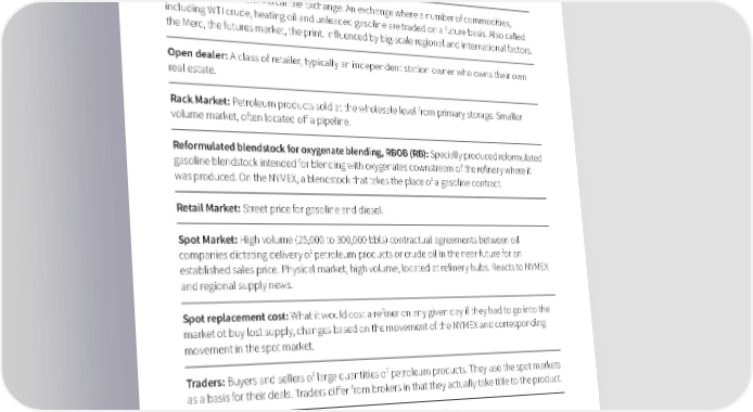 Margin: The difference between the retail price and delivered cost. Natural gas (NG): A naturally-occurring raw material often produced in conjunction with crude oil that is processed through a variety of facilities to yield NGLs. NYMEX: The New York Mercantile Exchange. An exchange where a number of commodities, including WTI crude, heating oil and unleaded gasoline are traded on a future basis. Also called the Merc, the futures market, the print. Influenced by big-scale regional and international factors. Open dealer: A class of retailer, typically an independent station owner who owns their own real estate. Rack Market: Petroleum products sold at the wholesale level from primary storage. Smaller volume market, often located off a pipeline. Reformulated blendstock for oxygenate blending, RBOB (RB): Specially produced reformulated gasoline blendstock intended for blending with oxygenates downstream of the refinery where it was produced. On the NYMEX, a blendstock that takes the place of a gasoline contract. Retail Market: Street price for gasoline and diesel. Spot Market: High volume (25,000 to 300,000 bbls) contractual agreements between oil companies dictating delivery of petroleum products or crude oil in the near future for an established sales price. Physical market, high volume, located at refinery hubs. Reacts to NYMEX and regional supply news. Spot replacement cost: What it would cost a refiner on any given day if they had to go into the market ot buy lost supply, changes based on the movement of the NYMEX and corresponding movement in the spot market. Traders: Buyers and sellers of large quantities of petroleum products. They use the spot markets as a basis for their deals. Traders differ from brokers in that they actually take title to the product. Truck and trailer: Approximately 8,000 gallons, or one load of fuel. Fuel Buying 101, Glossary of Terms | Oil Price Information Service (OPIS) © 2020, all rights reserved 26