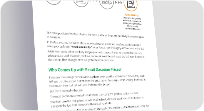 Part 3: Retail Markets RETAIL MARKET Street price for gasoline and diesel. Follows rack pricing, though reaction time is usually two/three days later. The retail portion of the fuel chain is the most visible to the public and likely the most complex to navigate. In the last section, we talked about wholesale racks, where fuel resellers, retailers and end users pick up fuel in “truck and trailer” quantities at one of roughly 400 terminals in the U.S. Aside from some other ancillary shipping-related charges, there’s no tax included in a rack price and, up until this point, we have not considered the cost to get the fuel from the rack to the station. That changes once we get to the retail price level. Who Comes Up with Retail Gasoline Prices? If you ask the average person who sets the price of gasoline at their local station, they might © OPIS by IHS Markit tell you that the station owner slaps the price tag on the pump – while shaking their head at how much their fuel bill eats into their monthly budget. But that’s not really the case. The most common way retail fuel is priced is by tying the gasoline station to a rack. You then take the rack price and add in all federal, state and local taxes PLUS the cost to transport the fuel from the rack to the actual retail site. That final number is a laid-in retail cost. The goal of the retailer couldn’t be simpler: price the fuel above the total laid-in cost. On top of that, most retailers will, indeed, add in their own “margin,” which is what they estimate their own profit to be. That margin is their lifeblood. But, based on what we covered above, most of the price at the pump is not dictated by the station owner. Fuel Buying 101, Part 3: Retail Markets | Oil Price Information Service (OPIS) © 2020, all rights reserved 18