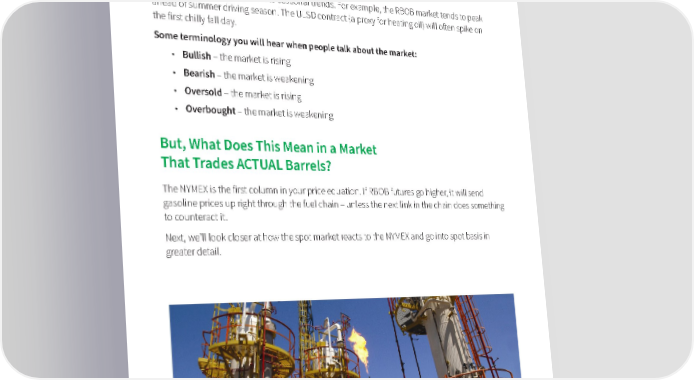 Sometimes the market “prices in” so-called fundamental factors. For example, if the U.S. government is expected to show crude stock supplies falling by a large amount, the market might slowly crawl higher in advance of the weekly inventory report as opposed to rallying sharply when expectations prove true. On the other hand, a quickly developing weather event can lead to immediate price swings. And the market also responds to seasonal trends. For example, the RBOB market tends to peak ahead of summer driving season. The ULSD contract (a proxy for heating oil) will often spike on the first chilly fall day. Some terminology you will hear when people talk about the market: • Bullish – the market is rising • Bearish – the market is weakening • Oversold – the market is rising • Overbought – the market is weakening But, What Does This Mean in a Market That Trades ACTUAL Barrels? The NYMEX is the first column in your price equation. If RBOB futures go higher, it will send gasoline prices up right through the fuel chain – unless the next link in the chain does something to counteract it. Next, we’ll look closer at how the spot market reacts to the NYMEX and go into spot basis in greater detail. Fuel Buying 101, Part 1: Futures and Spot Markets | Oil Price Information Service (OPIS) © 2020, all rights reserved 7